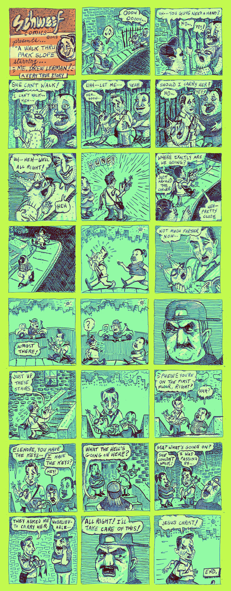 In the second installment of a collaboration between Blunderbuss and Schweef Comics, Drew sweeps an elderly Brooklynite off her feet.