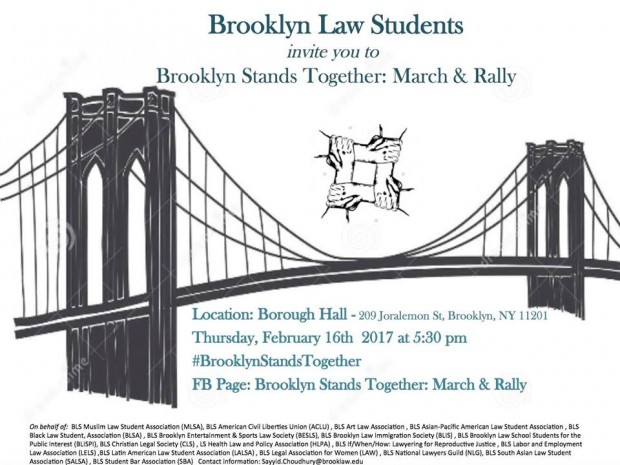 Brooklyn Law School and the people who make up the great borough of Brooklyn will combine our voices as one on Thursday, February 16th to show the world that our rights will not be trumped upon. Join us at Brooklyn Borough Hall at 5:30pm for a march to the Eastern District of New York’s Federal Courthouse and back to Borough Hall, where we will rally and voice our opinions together!
