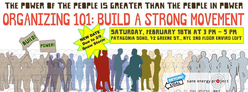 Join the Sierra Club Beyond Coal Campaign and the Sane Energy Project for a workshop on the basic building block of organizing: the 1-on-1 conversation. This highly participatory workshop will help you reach new people and kick-start the movement we need. Although it will focus on climate change/renewable energy, the basic skills will apply to many different causes.