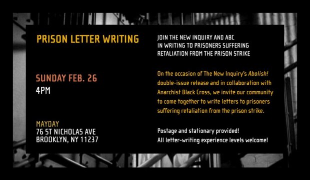 On the occasion of The New Inquiry’s Abolish! double-issue release, and in collaboration with Anarchist Black Cross, we invite our community to come together to write letters to prisoners suffering retaliation from the prison strike.