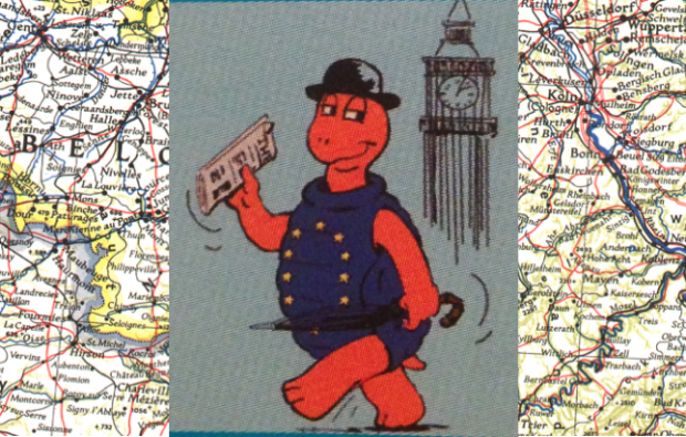 The turtle is the undisputed star of the Mini-Europe booklet. Along with photographs, fun facts, and descriptions of the reduced-size monuments, the booklet boasts color illustrations of the turtle sporting various stereotypical nationalistic props and outfits, one for each every country.
