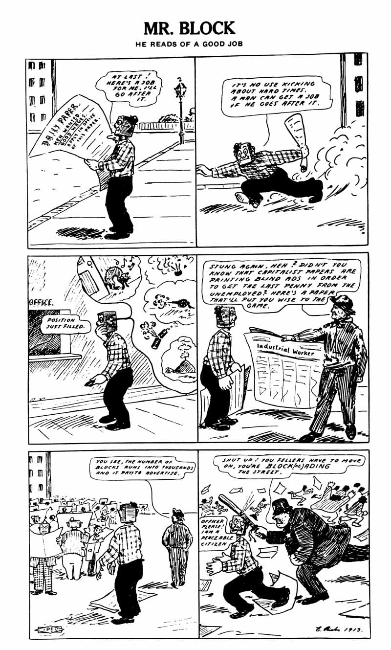 Blunderbuss is excited to run these public domain comics, provided courtesy of IWW.org. In the third of the 24 existent Mr. Block comics, our hero goes looking for a job but finds the business end of a nightstick.