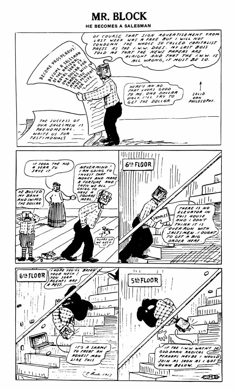 In this fifth comic from 1912 Spokane Industrial Worker, Mr. Block tests his salesmanship while stubbornly avoiding the radical Wobblies.