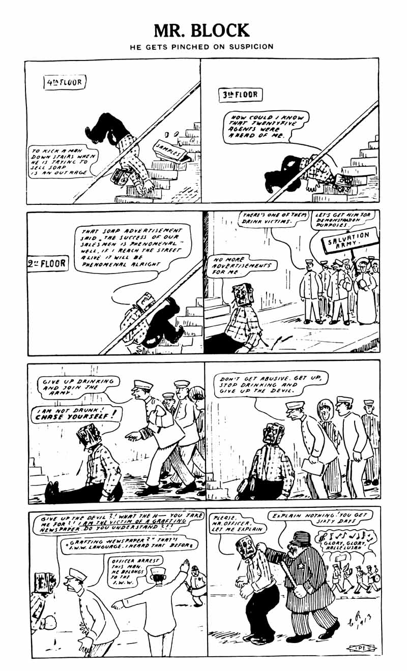 Blunderbuss is excited to run these public domain comics, provided courtesy of IWW.org. In the sixth of the 24 existent Mr. Block comics, our hero is hurled down the stairs and into the less-than-loving arms of religious zealots.
