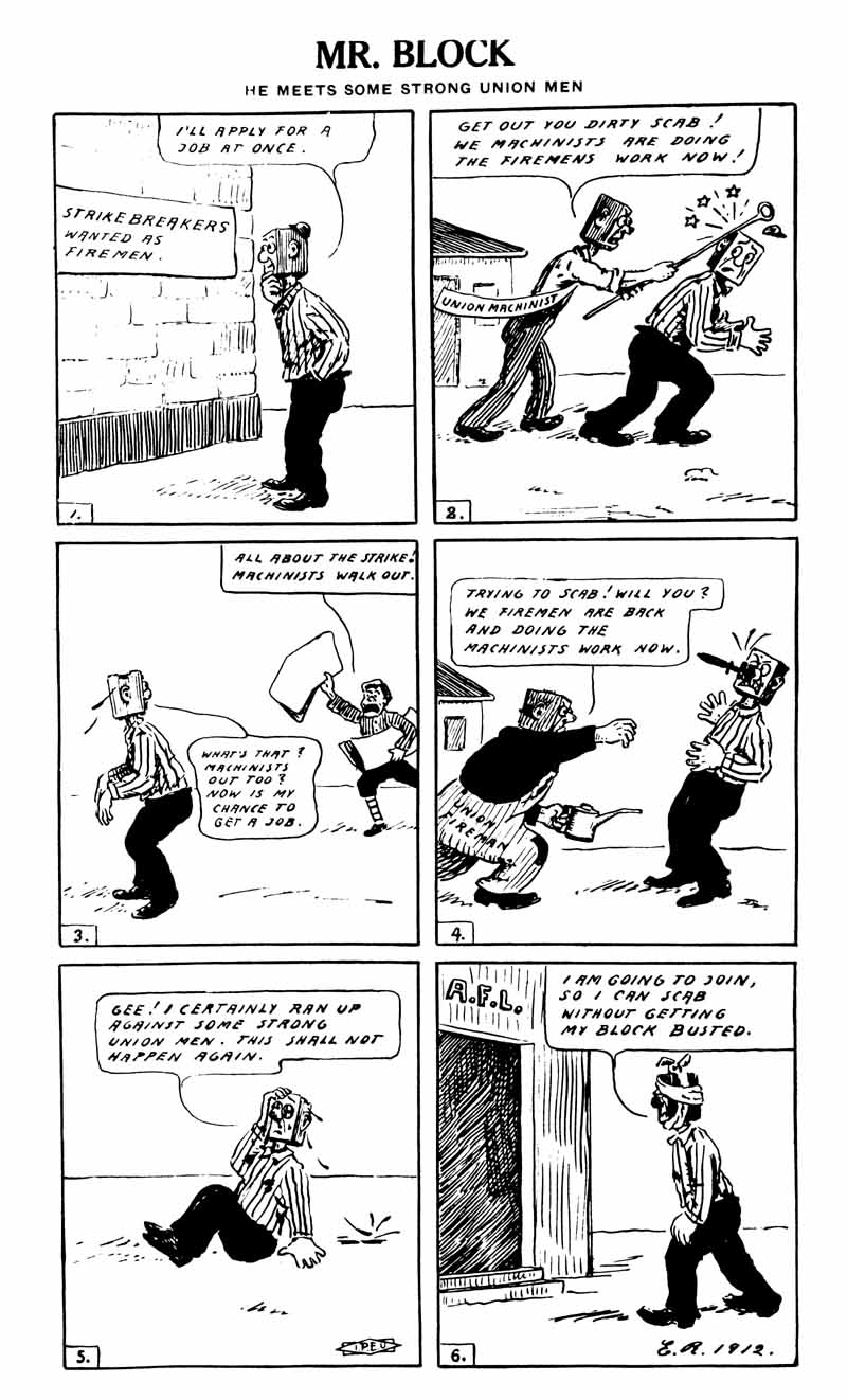 Comics and politics were intermingling long before Alan Moore and David Lloyd ever slapped a Guy Fawkes mask on their freedom fighting hero in V for Vendetta. Back in 1912, a German immigrant named Ernest Riebe started drawing his Mr. Block comics for the Spokane Industrial Worker, a newspaper associated with the militant Industrial Workers of the World, better known as the Wobblies. “Mr. Block is legion,” Walker C. Smith writes in the introduction to a 1984 collection of Riebe’s comics. “He is representative of the host of slaves who think in terms of their masters. Mr. Block owns nothing, yet he speaks from the standpoint of the millionaire; he is patriotic without patrimony; he is a law-abiding outlaw; he boasts of ‘our tremendous wheat exports,’ yet has no bread on his table; he licks the hand that smites him and kisses the boot that kicks him; he is the personification of all that a worker should not be.”