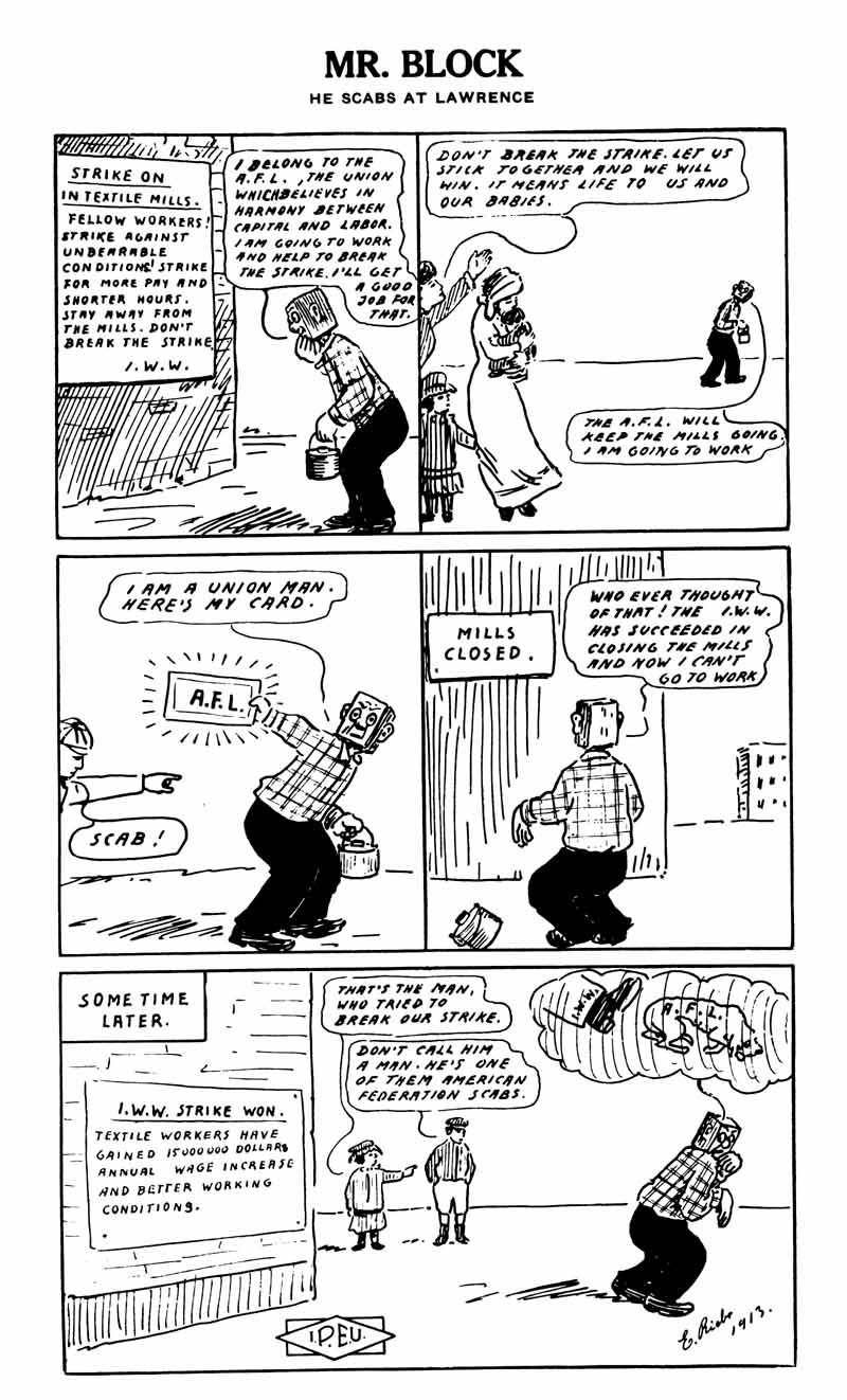 Comics and politics were intermingling long before Alan Moore and David Lloyd ever slapped a Guy Fawkes mask on their freedom fighting hero in V for Vendetta. Back in 1912, a German immigrant named Ernest Riebe started drawing his Mr. Block comics for the Spokane Industrial Worker, a newspaper associated with the militant Industrial Workers of the World, better known as the Wobblies. “Mr. Block is legion,” Walker C. Smith writes in the introduction to a 1984 collection of Riebe’s comics. “He is representative of the host of slaves who think in terms of their masters. Mr. Block owns nothing, yet he speaks from the standpoint of the millionaire; he is patriotic without patrimony; he is a law-abiding outlaw; he boasts of ‘our tremendous wheat exports,’ yet has no bread on his table; he licks the hand that smites him and kisses the boot that kicks him; he is the personification of all that a worker should not be.”