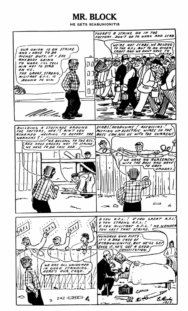 Ernest Riebe immigrated to the United States from his native Germany sometime around the turn of the 20th century. Not much of his biography is known. His “Mr. Block” comics began appearing in the Spokane Industrial Worker in 1912, and his art appeared in IWW publications through 1922. His eventual fate is also unknown, but his most famous creation was immortalized in a song by Joe Hill titled, appropriately, “Mr. Block.”