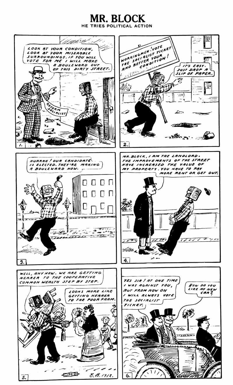 Comics and politics were intermingling long before Alan Moore and David Lloyd ever slapped a Guy Fawkes mask on their freedom fighting hero in V for Vendetta. Back in 1912, a German immigrant named Ernest Riebe started drawing his Mr. Block comics for the Spokane Industrial Worker, a newspaper associated with the militant Industrial Workers of the World, better known as the Wobblies. “Mr. Block is legion,” Walker C. Smith writes in the introduction to a 1984 collection of Riebe’s comics. “He is representative of the host of slaves who think in terms of their masters. Mr. Block owns nothing, yet he speaks from the standpoint of the millionaire; he is patriotic without patrimony; he is a law-abiding outlaw; he boasts of ‘our tremendous wheat exports,’ yet has no bread on his table; he licks the hand that smites him and kisses the boot that kicks him; he is the personification of all that a worker should not be.”