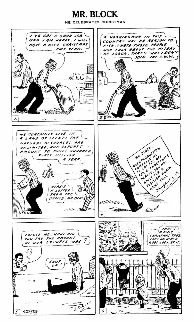 Blunderbuss is excited to run these public domain comics, provided courtesy of IWW.org. In the 17th of the 24 existent Mr. Block comics, our hero has tinsel pulled over his eyes by some holiday fat cats.