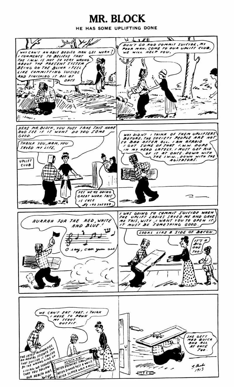 Comics and politics were intermingling long before Alan Moore and David Lloyd ever slapped a Guy Fawkes mask on their freedom fighting hero in V for Vendetta. Back in 1912, a German immigrant named Ernest Riebe started drawing his Mr. Block comics for the Spokane Industrial Worker, a newspaper associated with the militant Industrial Workers of the World, better known as the Wobblies. “Mr. Block is legion,” Walker C. Smith writes in the introduction to a 1984 collection of Riebe’s comics. “He is representative of the host of slaves who think in terms of their masters. Mr. Block owns nothing, yet he speaks from the standpoint of the millionaire; he is patriotic without patrimony; he is a law-abiding outlaw; he boasts of ‘our tremendous wheat exports,’ yet has no bread on his table; he licks the hand that smites him and kisses the boot that kicks him; he is the personification of all that a worker should not be.”