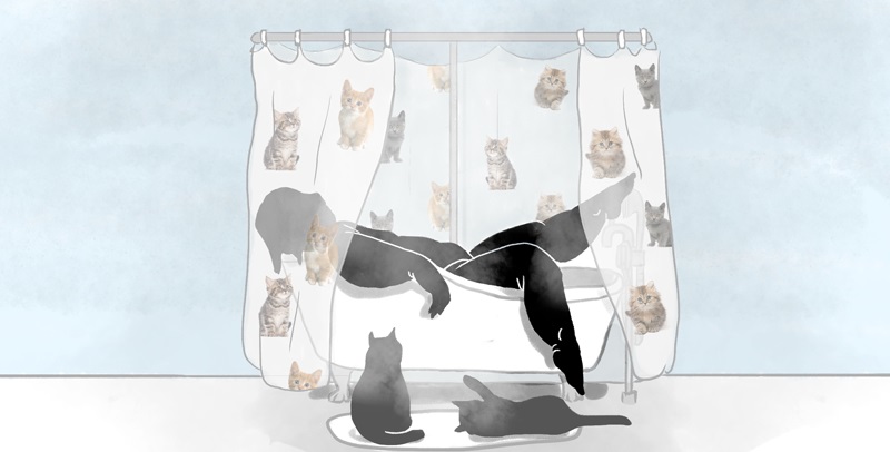 A past employer had once told her that the cats in photos were dead, stuffed, with glass eyes, but she refused to believe that about her shower curtain cats. These were definitely real—just look at their expressions! She leaned toward the curtain, sucked air in through her mouth so that the plastic attached itself to her lips in an idle play-kiss.