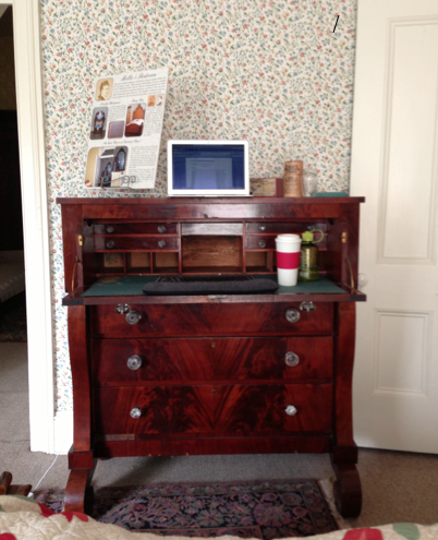 I spent the first half of the Residency-era hunched over my laptop at whatever desk or chair was around. I thought of it as being adaptable. But my pain increased the more I sat and wrote. I’ve seen acupuncturists, cranial sacral therapists, masseuses, and MDs. But the thing that really saved me was the discovery of THE STANDING DESK. I started asking for accommodations at each residency. They were more than happy to help, each with their own quirky resourcefulness. At Ragdale, where I decided to excise a whole fifty-page section in which my character, West, is hospitalized, I wrote on a bookshelf. In Springfield, where I researched 19th-century prostitutes, I wrote on a 100-year-old dresser with a fold-down shelf that made the perfect desk. At Spiro Arts, where I queried agents and learned to think of my novel as a consumable object, I carried an AV cart up a couple flights of stairs and situated it in front of my big mountain-facing windows. At Brush Creek, where I polished the novel from 420 pages to 380, they actually gave me an adjustable table.