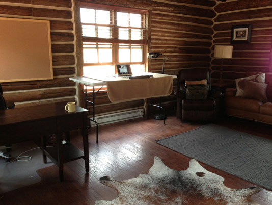 Brush Creek Wyoming residency cabin and standing desk (before I went ergonomic).